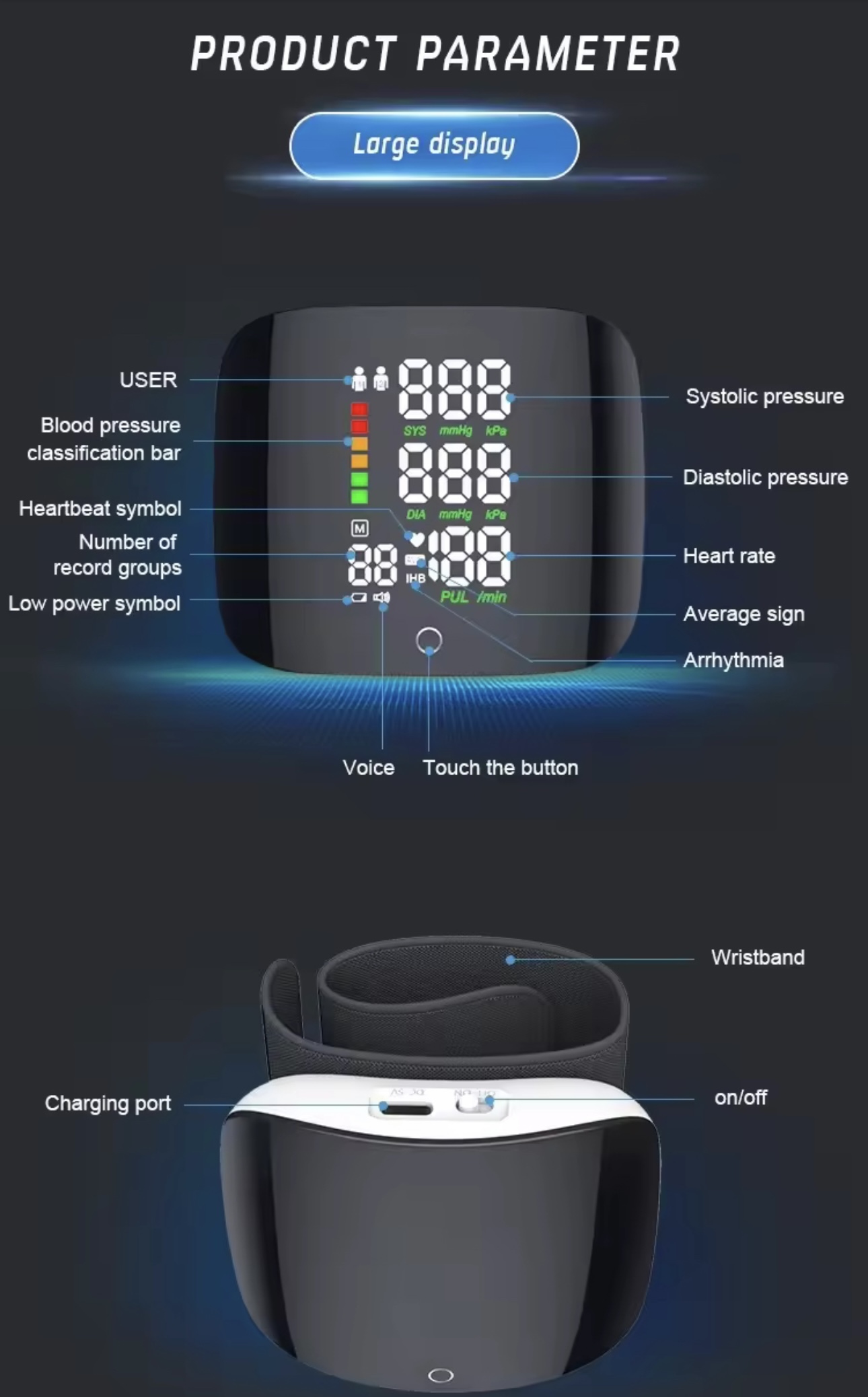 Experience next-generation health monitoring with the Wrist Electronic Blood Pressure Monitor — a compact, accurate, and user-friendly device engineered for real-time cardiovascular tracking. Designed to fit comfortably on the wrist, this device provides fast and reliable readings of systolic and diastolic blood pressure, heart rate, and arrhythmia detection, all displayed on a large LED digital interface.
